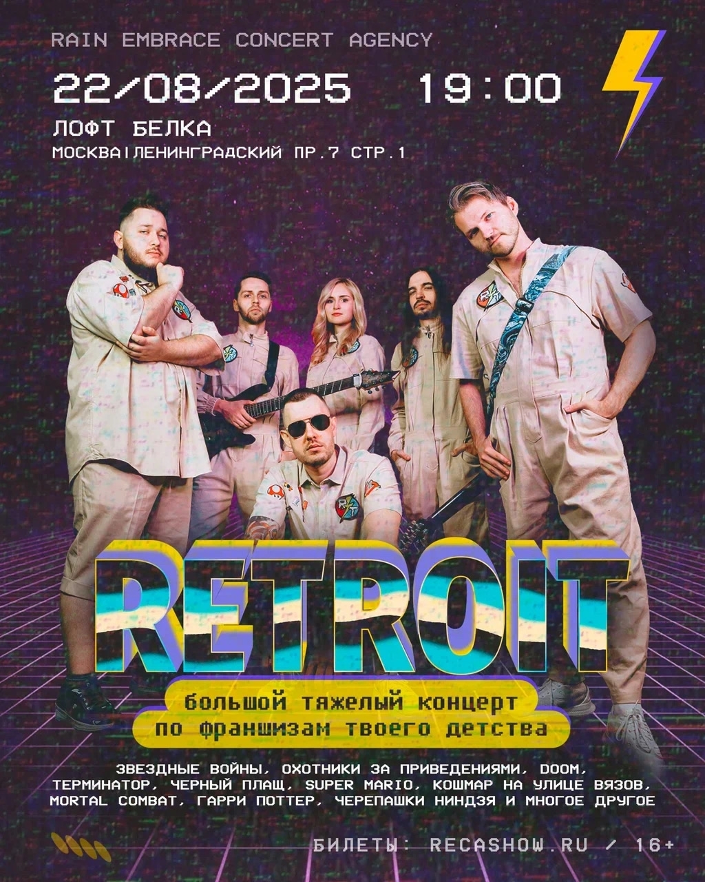 Погрузитесь в атмосферу ностальгии, где легендарные мелодии из вашего детства и юности обретут новое тяжелое звучание. Retroit проведет вас сквозь культовые кинофраншизы, легендарные видеоигры и анимацию, добавив к ним мощные брейки, гитарные риффы и мелодичный женский вокал. Это будет вечер, где музыка прошлого встретится с мощной энергией.